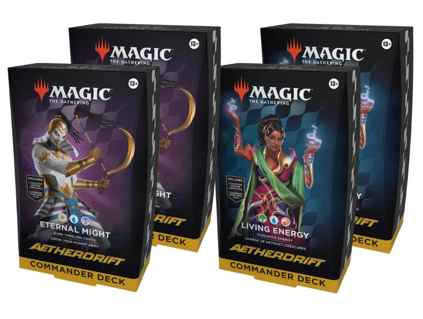 In Commander, four players come together to show their strength and strategy, with one player coming out on top. Each 100-card ready-to-play Aetherdrift Commander Deck makes it easy for Commander fans in your store to grab a deck and play right away.